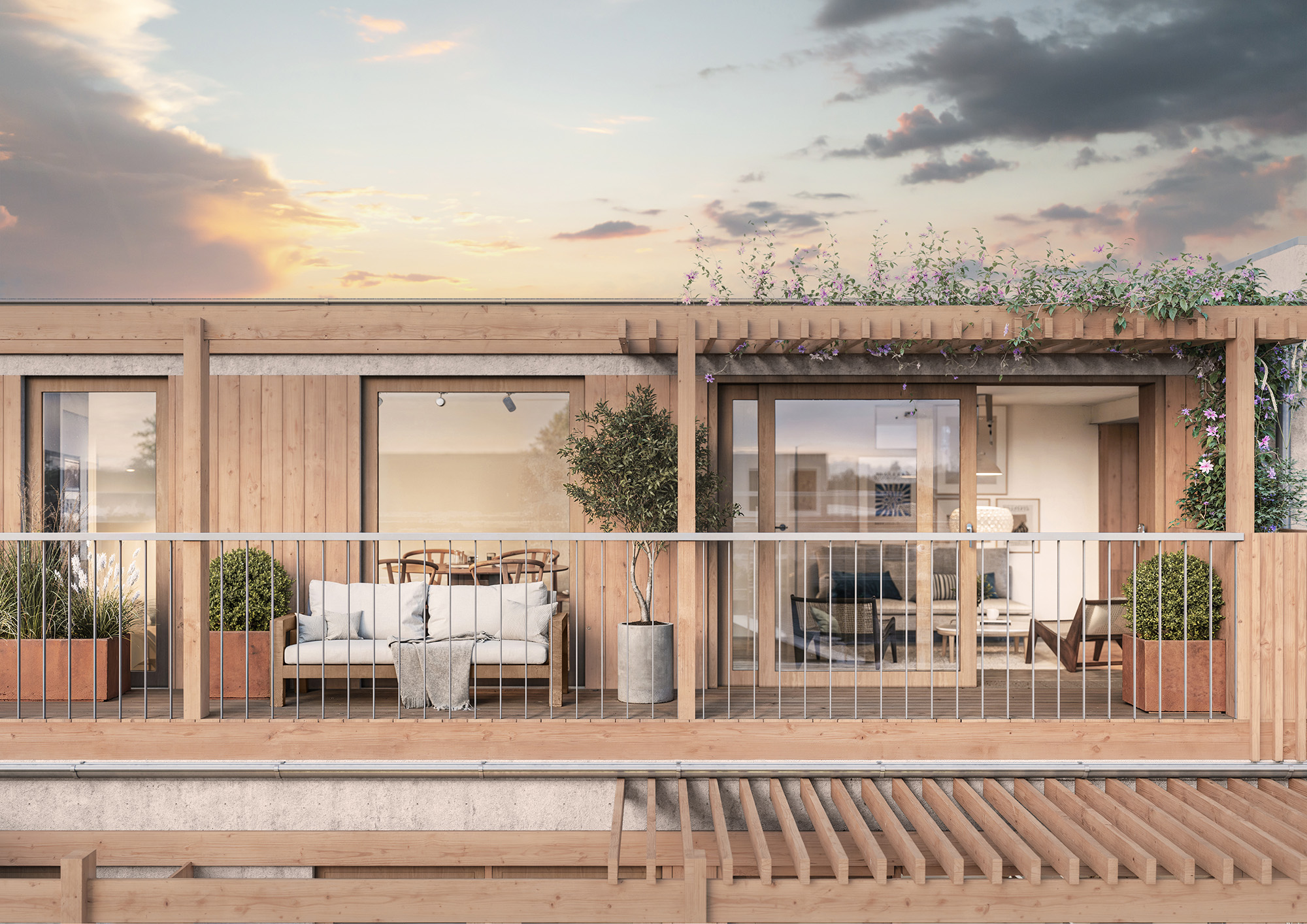 De generösa balkongerna är utrustade med integrerade planteringslådor som möjliggör riklig växtlighet, vilket bidrar till både biologisk mångfald och välbefinnande för de boende. Trädetaljer på balkongräcken och fasad skapar en naturlig övergång mellan ute och inne. På våning fyra och fem täcks balkongerna delvis av i en pergola som skapar en härlig rymd.